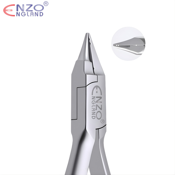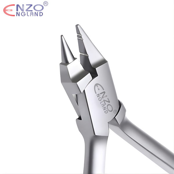 Featuring three Grooves, with two at the tip and one at the Flat bottom end. This Light wire forming plier makes an Orthodontist’s job more easier by allowing you to grip the wire firmly and make delicate bends and loops with a locked grip on the wire.