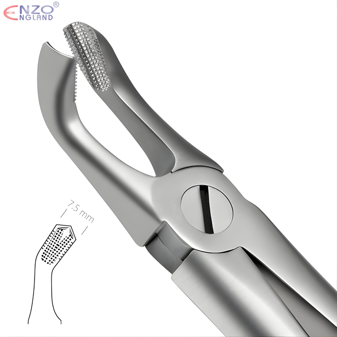 The serrated grabbing jaws, each 7.5mm wide, are curved to ensure a firm, non-slip grip on the wisdom tooth. When applying pulling or rotational pressure, the wide, serrated design delivers exceptional control, helping prevent slippage even during difficult extractions.